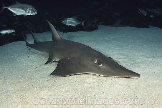 | A guitarfish hunting for crabs and shellfish on the seabed. |